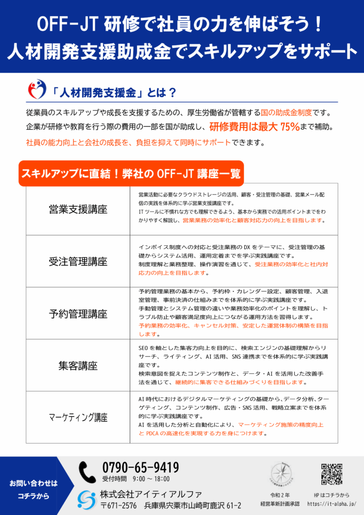 | 1.営業支援 | ◆クラウドストレージサービスについて ・クラウドストレージについて ・Google Drive操作方法 ・Google Driveセットアップ方法 ◆顧客管理について ・受注について ・顧客情報について ◆営業メール配信について |